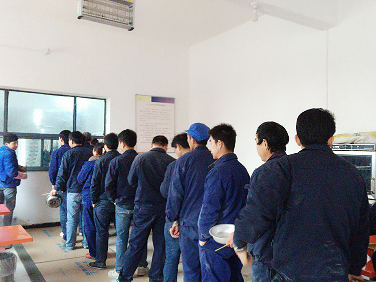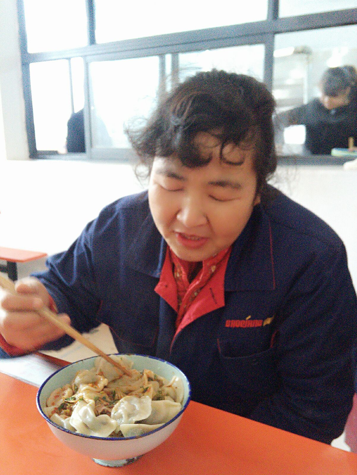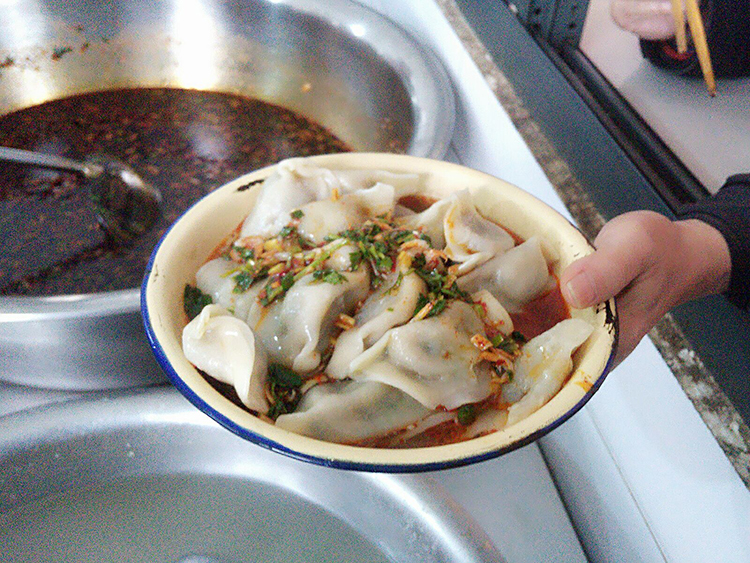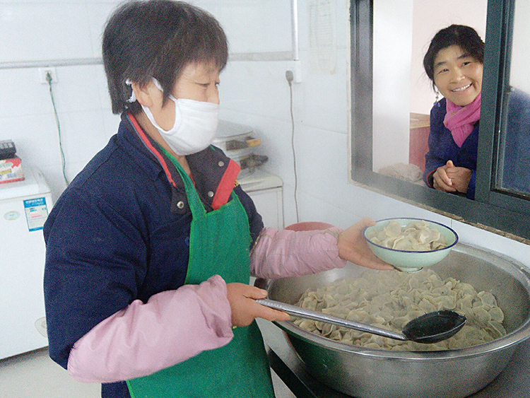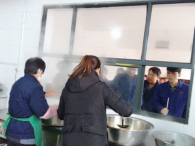 后勤人员为每位员工打上满满一碗热腾腾的水饺,再配上美味的蘸料